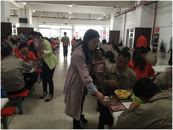 銷售人員現(xiàn)場(chǎng)派發(fā)宣傳單頁(yè)、戶型圖,并以易拉寶展示等形式宣傳推介樓盤,現(xiàn)場(chǎng)氣氛活躍,有購(gòu)買意向的員工對(duì)購(gòu)買條件和所售戶型進(jìn)行了現(xiàn)場(chǎng)咨詢。