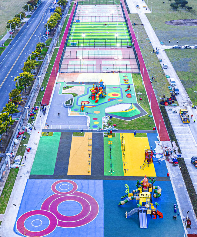 該項目所處位置原為一處待開發(fā)地塊,園區(qū)根據(jù)居民需求規(guī)劃建設(shè)健身跑道、全齡段健身區(qū)、綜合兒童活動區(qū)、平地輪滑場、廣場舞片區(qū)和各類球場(其中羽毛球四組、網(wǎng)球場一組,7人制籠式足球場一組、籠式籃球場四組),同步建設(shè)公廁、停車場等配套設(shè)施。