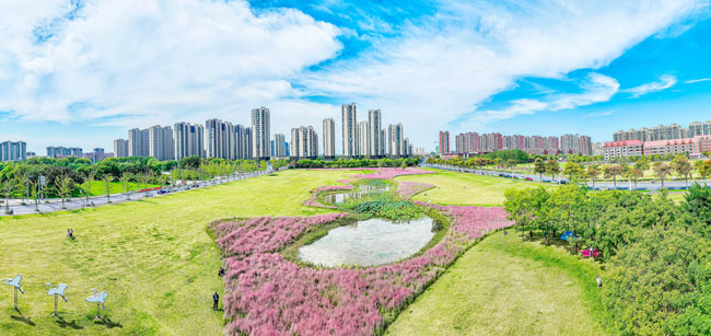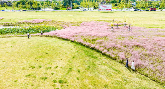 2023年10月1日,蘇宿工業(yè)園區(qū)蘇州公園北側(cè)綠地的粉黛亂子草盛開了,一片片粉色花海如夢(mèng)似幻,吸引游人前來(lái)觀賞,樂(lè)享國(guó)慶假期。