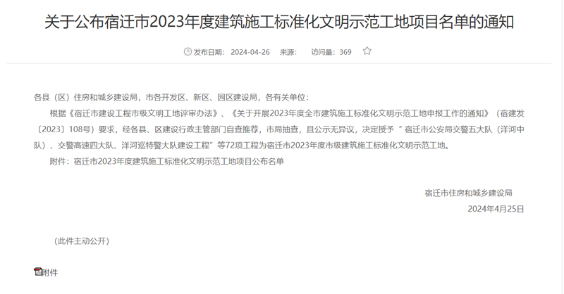 近日,宿遷市2023年度建筑施工標(biāo)準(zhǔn)化文明示范工地項(xiàng)目名單發(fā)布,蘇宿工業(yè)園區(qū)智慧信息產(chǎn)業(yè)園項(xiàng)目榮獲2023年度市級(jí)建筑施工標(biāo)準(zhǔn)化文明示范工地榮譽(yù)稱(chēng)號(hào)。