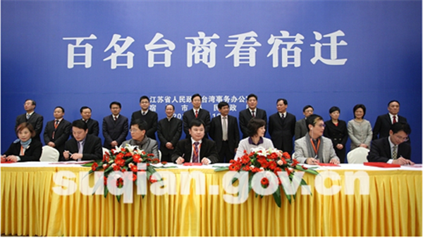 在宿遷投資環(huán)境推介會(huì)上還隆重舉行了項(xiàng)目簽約儀式。經(jīng)過(guò)前期深入溝通和洽談,此次“百名臺(tái)商看宿遷”活動(dòng)取得了一批可喜的項(xiàng)目合作成果,宿豫區(qū)、宿城區(qū)、宿遷經(jīng)濟(jì)開(kāi)發(fā)區(qū)和市有關(guān)部門(mén)與臺(tái)灣島內(nèi)企業(yè)共達(dá)成13個(gè)項(xiàng)目投資意向,協(xié)議總投資達(dá)114.4億元,涉及新能源、新材料、軟件服務(wù)外包、機(jī)械制造、環(huán)保科技、電子、食品等多個(gè)領(lǐng)域。