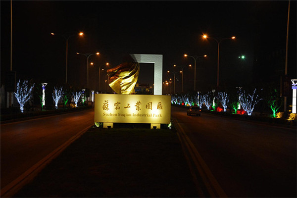 在園區(qū)東入口為民河的一畔,一座座生動(dòng)的城市剪影燈光造型在青海湖西路兩側(cè)一字排開(kāi)。有象征著新加坡元素的“魚(yú)尾獅”,有蘇州工業(yè)園區(qū)金雞湖畔的東方之門(mén)、摩天輪和李公堤,還有西楚霸王項(xiàng)羽騎馬的颯爽英姿。造型以蘇州、宿遷和新加坡城市建筑輪廓線、城市主題雕塑為基本元素,以剪影形式為載體,以現(xiàn)代高科技LED燈光為表現(xiàn)手段,通過(guò)炫麗動(dòng)感的光影效果,在夜色中描繪出了一副靚麗多姿的畫(huà)卷,生動(dòng)地展現(xiàn)出了園區(qū)“從新加坡到蘇州再到宿遷”和“在宿遷、為宿遷”的發(fā)展理念。