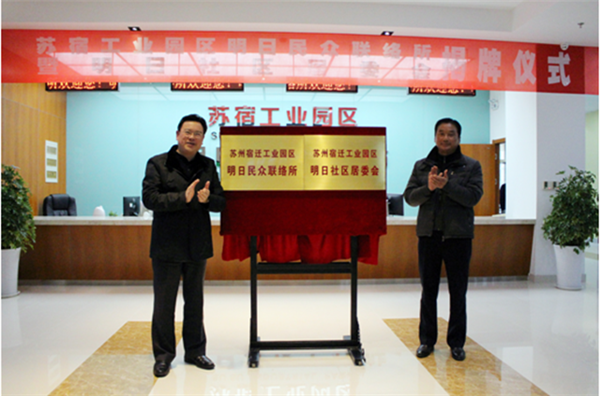 1月6日,宿遷市副市長,蘇宿園區(qū)黨工委書記、管委會(huì)主任方文浜與居民代表侍軍共同為明日民眾聯(lián)絡(luò)所和明日社區(qū)居委會(huì)揭牌,園區(qū)第二個(gè)民眾聯(lián)絡(luò)所正式建成投用,第一個(gè)社區(qū)居委會(huì)正式成立。